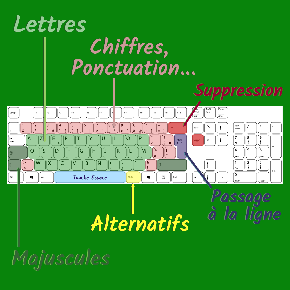 On y trouve aussi les touches pour supprimer des caractères (Suppr et ←) et le passage à la ligne (Entrée)